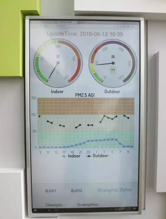 微软公司通过空气质量检测仪获取了北京的空气指数和微软室内的空气指数,除此外,不同城市的空气质量也都集中在了一起。