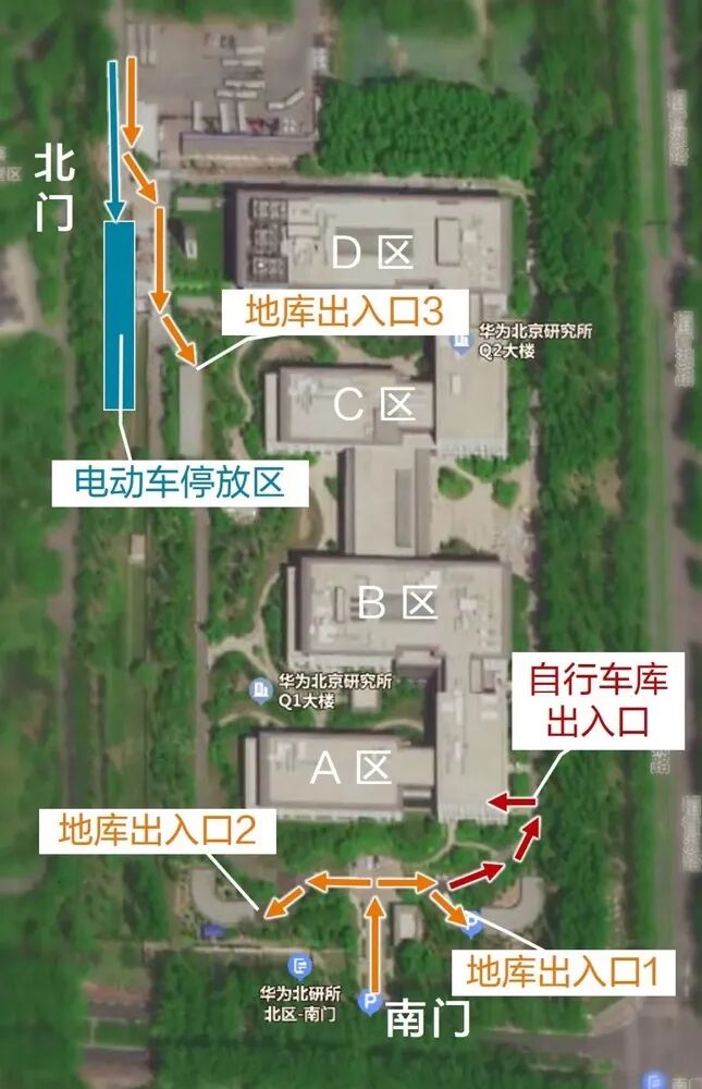 华为·北京K园区入驻时,也为员工清晰标明通勤交通状况,比如班车停靠点位置、路线,地下车库、电动车停放区、自行车库位置等。