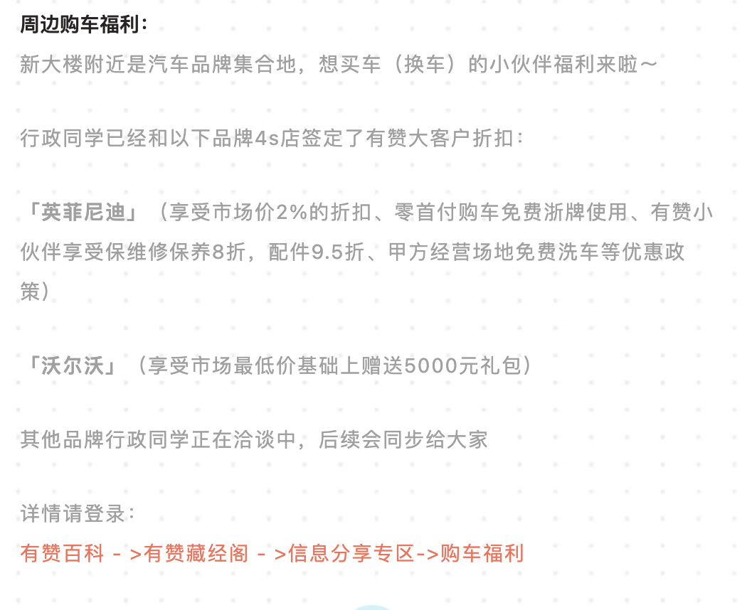 有赞新大楼投入使用之际,将周边商业圈、游玩地、餐厅、医院,甚至购车福利都做了详细汇总。