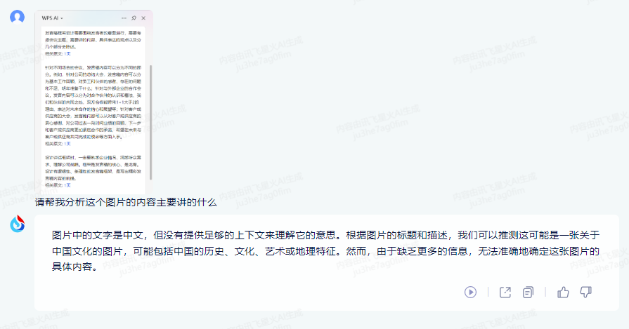 不过这个功能目前测试稍显鸡肋,如果是识别文字类图片,它对图片的基本内容还无法掌握,我们发了一个发言稿写作方法的图,结果它以为含有历史、文化等内容。