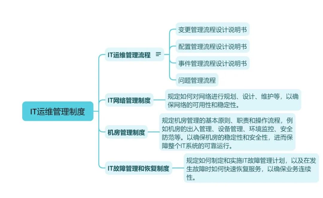 企业的IT运维管理一般会涉及到运维管理流程(如变更管理流程、配置管理流程等);网络管理制度;机房管理制度;故障管理与恢复等内容。